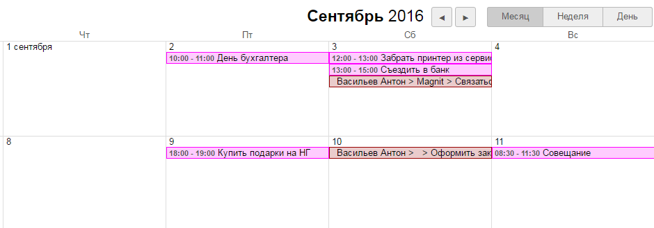 Благодаря удобному интерфейсу планировать свой рабочий день стало гораздо удобнее. Варианты отображения календаря по месяцам, неделям и дням позволят найти свободное время для новых задач и событий. Редактировать и добавлять новые, устанавливать даты начала и окончания событий можно прямо из интерфейса календаря. Каждому типу событий можно назначить свой цвет.