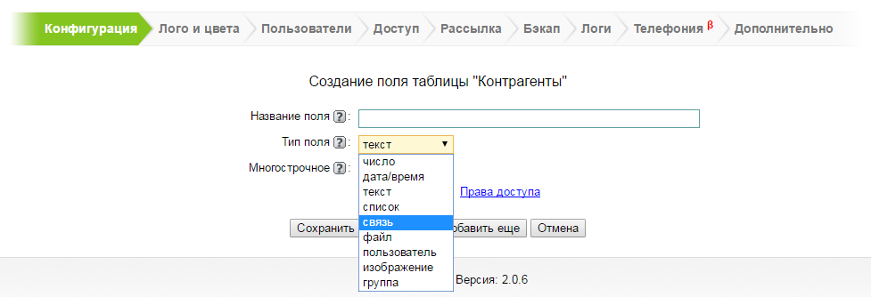 Конструктор таблиц поддерживает множество типов полей: текст, число, дата и время, список, связь, файл, изображение и другие.