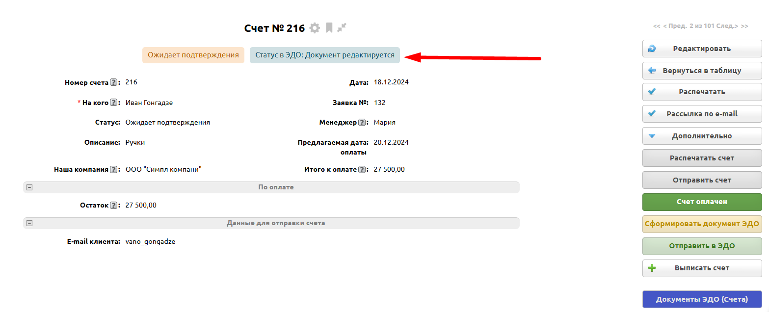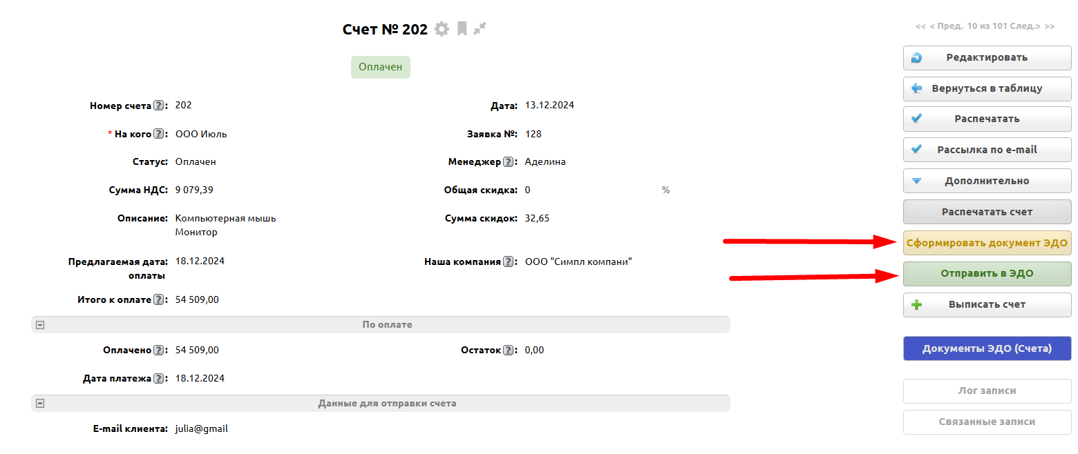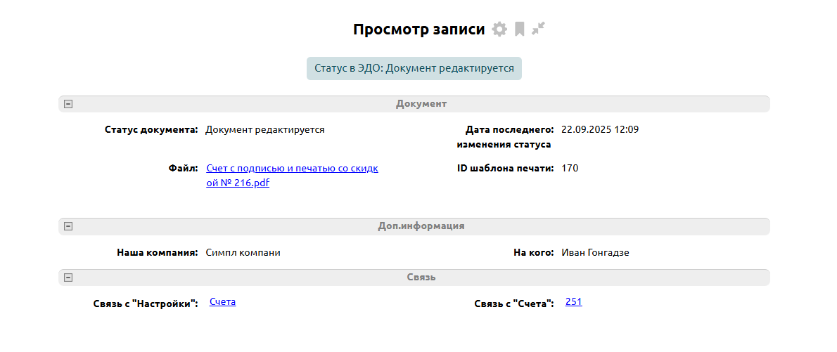 Данный модуль позволяет автоматизировать и значительно ускорить документооборот между вашей CRM и сервисом Saby. После простой настройки вы сможете создавать электронные документы, например счета или акты, прямо из карточки сделки или счета, не тратя время на ручной ввод данных. Документы легко отправляются в Saby для последующей подписи и пересылки контрагенту, что упрощает взаимодействие и ускоряет процессы.