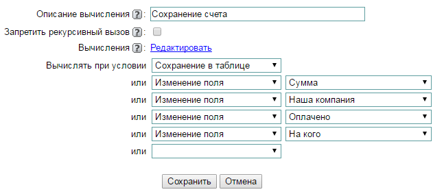 Вы можете настроить условия при которых будут срабатывать те или иные вычисления. Условиями могут быть: отображение поля, сохранение записи, редактирование, удаление или импорт. В случае условия при "Отображении поля" вычисление будет производится каждый раз, когда поле будет отображаться, в случае же "Сохранения записи" перерасчет будет производиться только при изменении записи. Это делается для того, чтобы можно было снять лишнюю нагрузку на сервер.