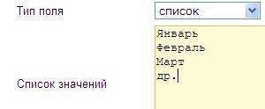 Предназначено для ввода данных из предустановленного списка. Например, вам требуется создать поле "Месяц". Соответственно, наилучшим решением будет создание списка с названиями месяцев, из которого потом можно будет выбирать подходящее значение. Начиная с версии 1.9.0, в поле "Список" появилась возможность выбирать не одно, а несколько значений.