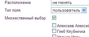 Поле типа "Пользователь" по свой сути похоже на поле типа "Связь", но вот ссылается оно не на поле таблицы, а на список пользователей. У этого типа есть возможность множественного выбора. По полю типа "Пользователь" чаще других настраиваются фильтры и напоминания.