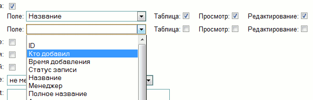 5. Обозначение расширенных прав доступа аналогично обозначению общих прав. Т.е. поставив галочку напротив значения "Таблица" вы будете видеть поле в общем списке таблицы. Поставив галочку напротив значения "Просмотр" вы сможете видеть поле при открытии информации о строке. Поставив галочку напротив значения ""Редактирование" вы сможете редактировать значение поля.