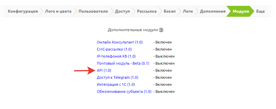 Для начала следует включить модуль API в настройках. Переходим в «Настройки», «Модули», выбираем модуль «API (1.0)».
