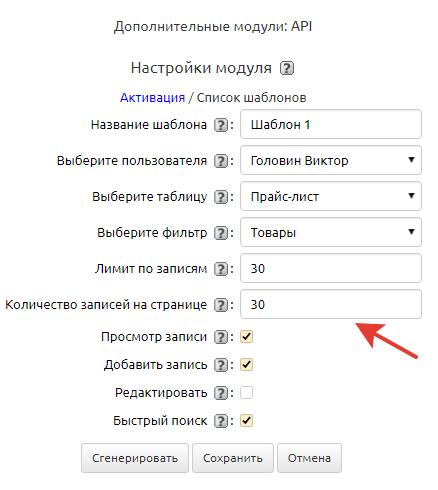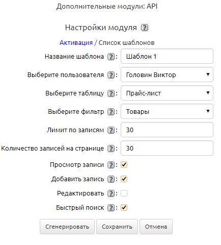 Перейдем в «Список шаблонов». Нажмите кнопку «добавить». Появится настройка шаблона, где можно выбрать название, пользователя, таблицу, используемый фильтр, лимит по записям, их количество на страницу. Отдельно стоит отметить настройку функционала шаблона: просмотр записей, добавление записей, редактирование, быстрый поиск. Не путайте его с правами пользователя.