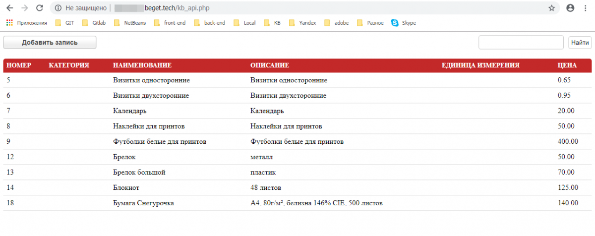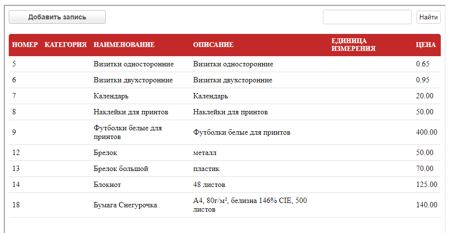 В результате на веб-странице мы увидим выбранную вами таблицу, а также если выставлены соответствующие настройки и есть на это права — действия с строками.