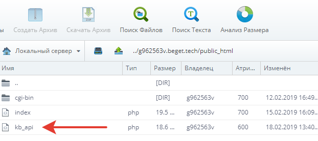 Создайте файл с расширением .php в удобном для вас каталоге хостинга или вашего локального сервера. Вставьте туда сгенерированный в шаблоне код. В нашем примере это kb_api.php.