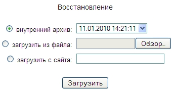 Если у вас есть файлы бэкапов, лежащие на вашем компьютере (сделанные при помощи функции системы "Копирование" "Во внешний файл", описанной в пункте 2 данной темы), то вы можете восстановить данные системы, используя эти файлы. При загрузке из внешнего файла вы должны будете указать путь к файлу на вашем компьютере, используя кнопку "Обзор". Внимание! Некоторые хостинги ограничивают загрузку файлов размером более 2 Мб, и в этом случае восстановления данных может не произойти. В такой ситуации есть два решения: первый вариант - попросить хостера увеличить размер загружаемого файла до необходимого, второй - залить файл в папку /backup через FTP и затем восстановить как внутренний архив.Восстановление с сайта