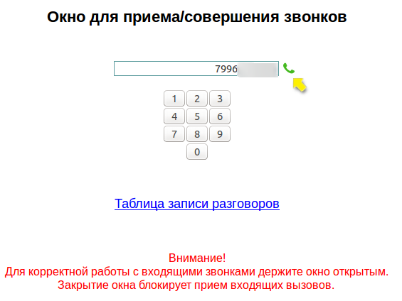 Внимание! Для приема входящих звонков в браузере «Окно для приема/совершения звонков» должно быть всегда открыто. Открыть его можно, нажав на иконку с телефонной трубкой в правом верхнем углу программы.