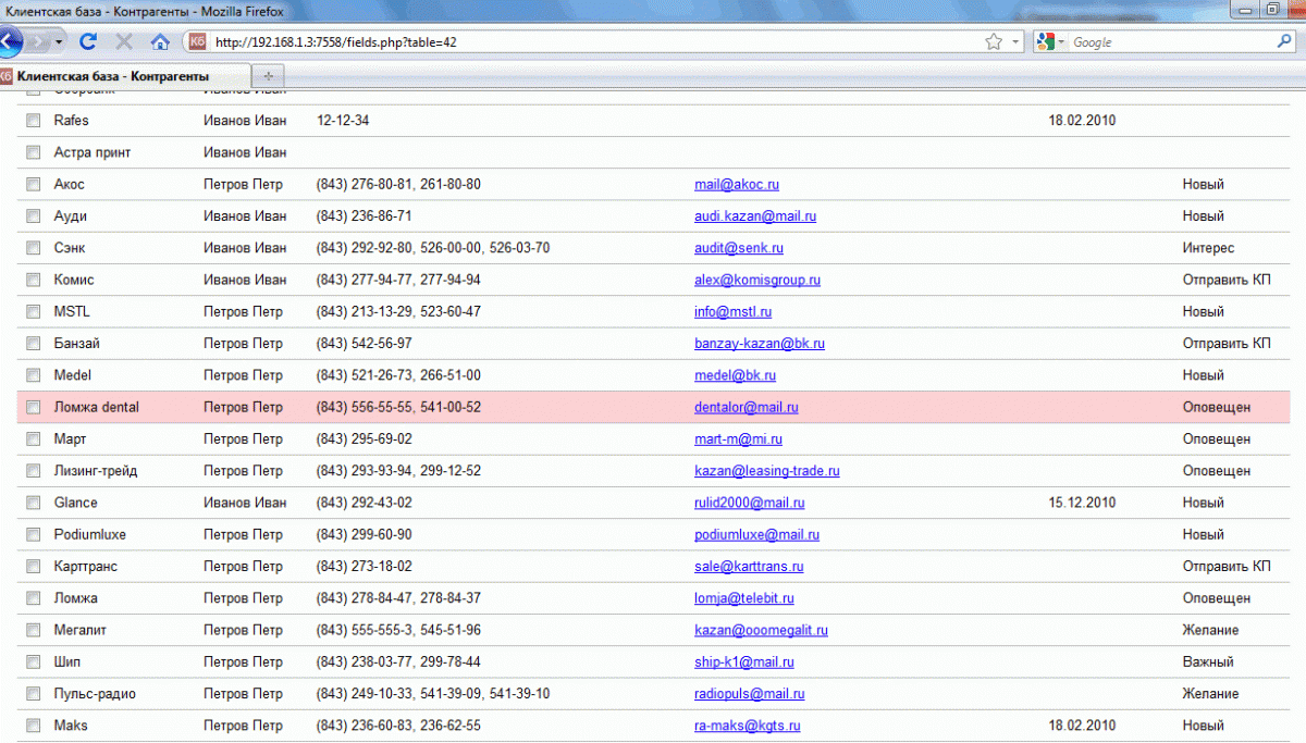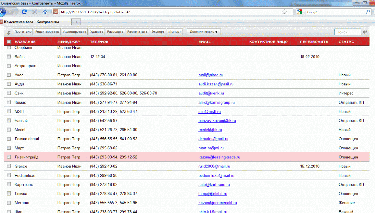 В CRM системе «Клиентская база» имеется функция вызова контекстного меню по щелчку правой кнопкой мыши (по аналогии с системными функциями ОС Windows). Программная функция работает на записях в таблицах. В контекстном меню вы сможете увидеть, какие варианты действий предлагаются для строки в текущей таблице.