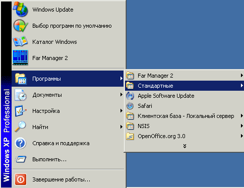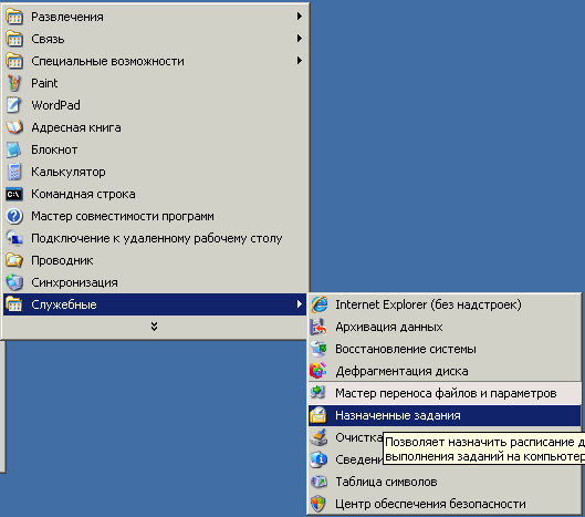 2. Откройте "Назначенные задания" в панели "Пуск -> Программы -> Стандартные -> Служебные"
