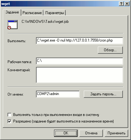 10. В строке "Выполнить" удалите старое значение и вставьте "c:wget.exe -O nul http://127.0.0.1:7558/cron.php".