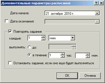 12. Поставьте галочку рядом с "повторять задание", интервал повторения должен быть равен 1 минуте. Нажмите кнопку "Ок".