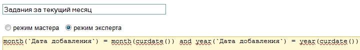 1. Допустим в таблице «Задания» нам нужно отобрать только те из них, которые в текущем назначались в этом месяце. Для этого в режиме эксперта необходимо добавить следующее условие Получаем такое условие: