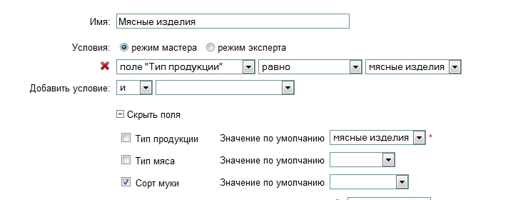 Также при создании фильтра возможно указать поля, которые по нему будут скрываться. Например, бывает необходимо в едином справочнике хранить похожие товары, но с несколько разными характеристиками. Так например не рационально организовывать две отдельных таблицы для хранения информации о товарах: колбасы и булки. Так-как значительная часть полей у них может быть общая. Например дата прихода, цена, цена продажи, дата поступления и т.д. Но также у каждого из этих товаров могут быть поля свойственные именно для этого товара. Например для булки — сорт муки, а для колбасы — тип мяса. В данном случае абсолютно логично чтобы при редактировании информации о булке видеть поля характеризующие именно булку, т.к. характеристики колбасы бессмысленны и могут только запутывать пользователя.