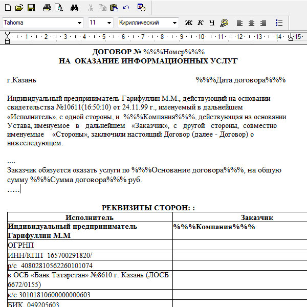 3. Прописать шаблоны полей в теле документа в формате %%%Имя поля%%%. Важный момент: во время набора шаблона поля знаки процента и имя поля должны быть набраны в одной раскладке (русской или английской) без переключения. Если у вас все таки не срабатывает какое то поле (выводится %%%Имя поля%%% вместо значения), то вы можете открыть этот же документ в блокноте и найти кусок кода типа:
