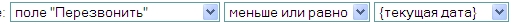 Теперь приступим к составлению условий. Первое условие, состоит в том, чтобы напоминание всплывало в тот, день, когда у нас стоит дата в поле "Перезвонить". Реализуем его с помощью конструктора "Добавить условие". Выбираем в списке поле "Перезвонить". У нас появляется ещё 2 списка. В первом из них выбираем условие <=, а во втором {текущая дата}. Нажав на кнопку "Добавить" в окне "Условия" мы получим следующую запись: `Перезвонить`<='{текущая дата}'.