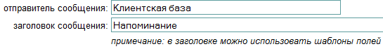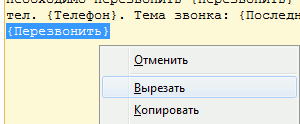 Необходимо перезвонить {Перезвонить} в {Полное название} по тел. {Телефон}. Тема звонка: {Последний разговор}. Шаблоны поля вставляются с помощью специального конструктора.