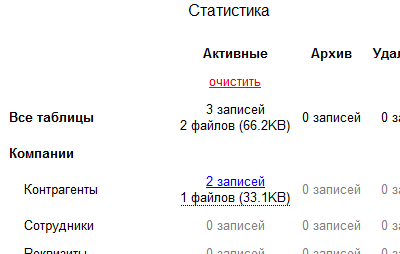 Перед вами откроется меню, в котором будет выдана информация по всем таблицам, включая вложенные файлы и их размер. Нажатием на соответствующую ссылку можно перейти к записям или раскрыть список файлов. Если вы хотите очистить корзину, архив или удалить активные записи по всей базе, нажмите на ссылку «очистить». Перед очисткой будет выдано предупреждение и создан бэкап.