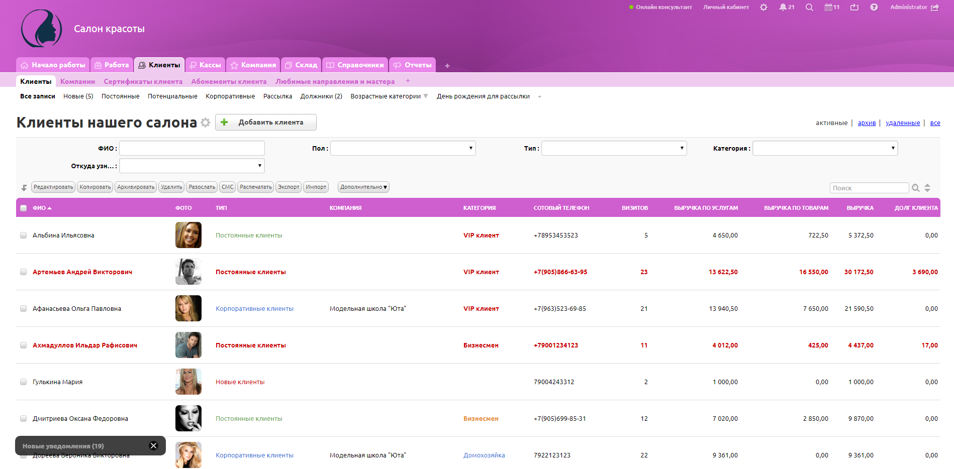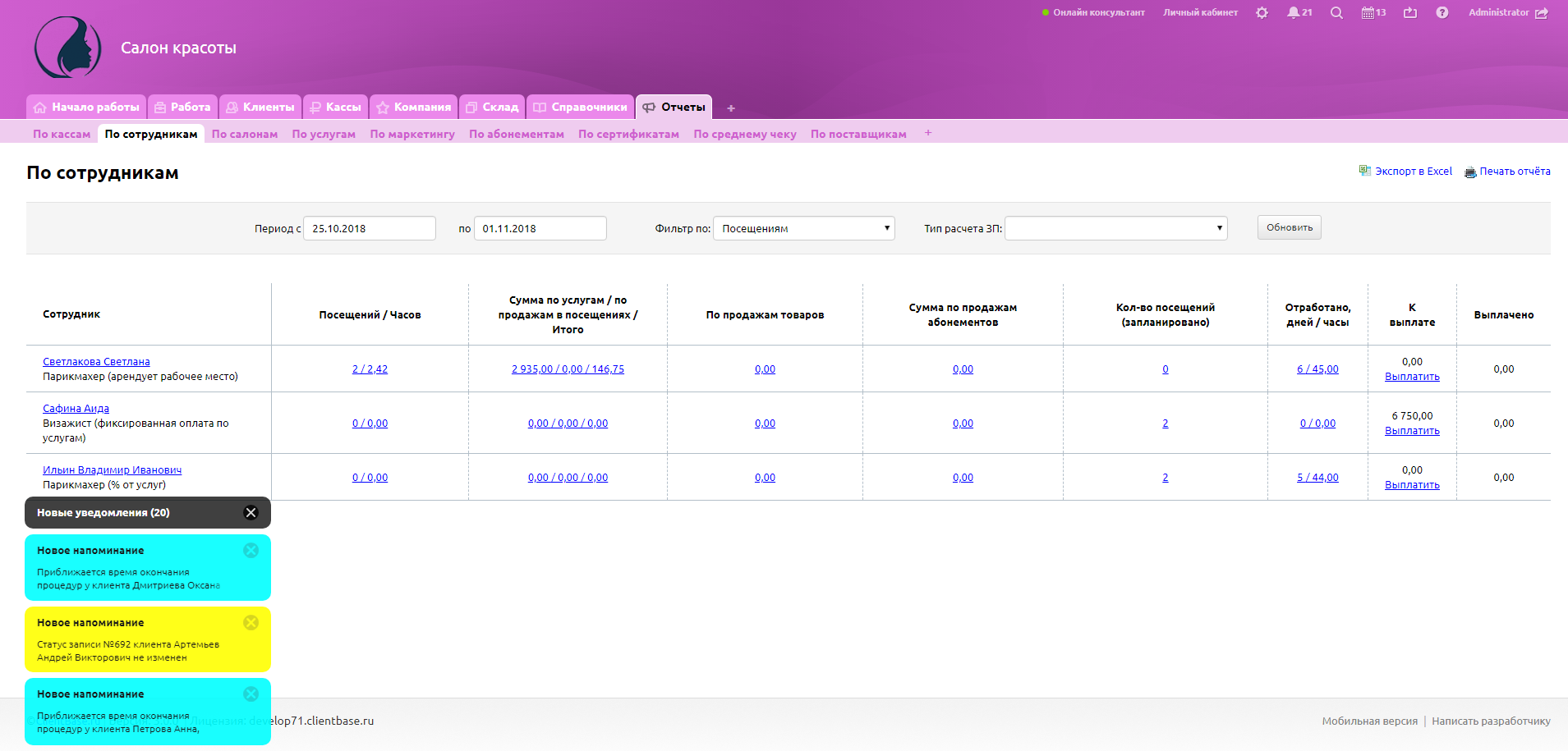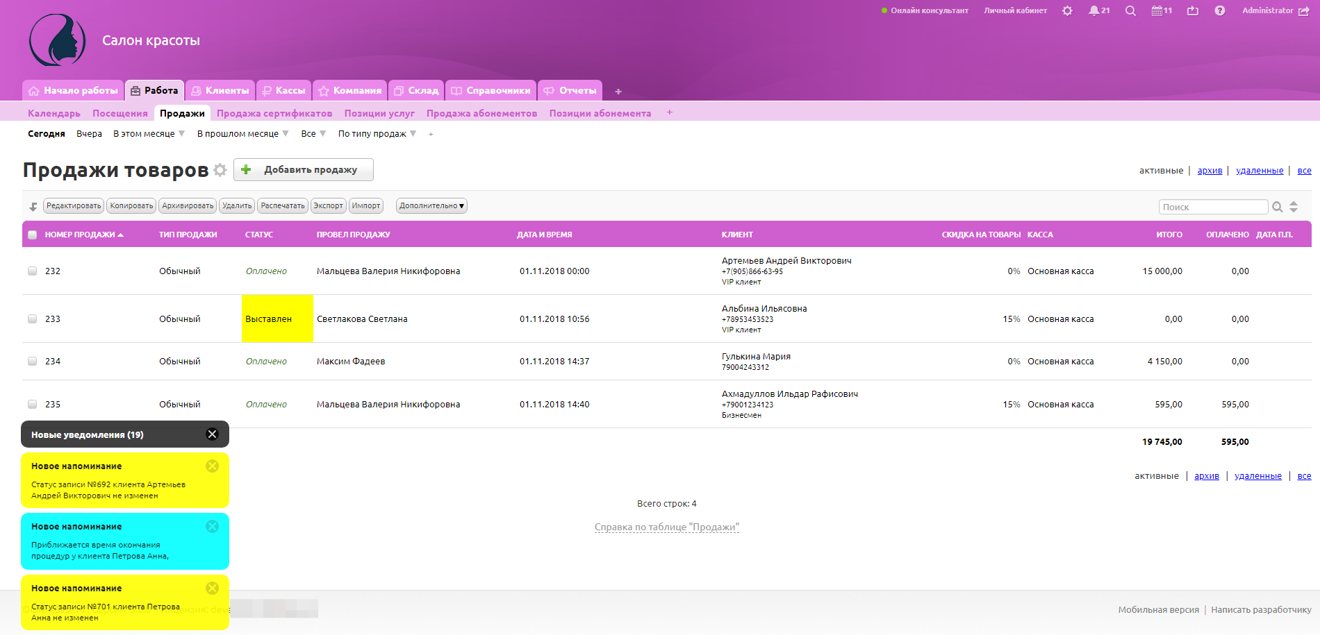 Также предусмотрена настройка напоминаний о предстоящих визитах с учетом истории посещений и частоты появления клиента в салоне. У посетителей создается приятное впечатление, что их помнят, и они охотнее выбирают именно Ваш салон.