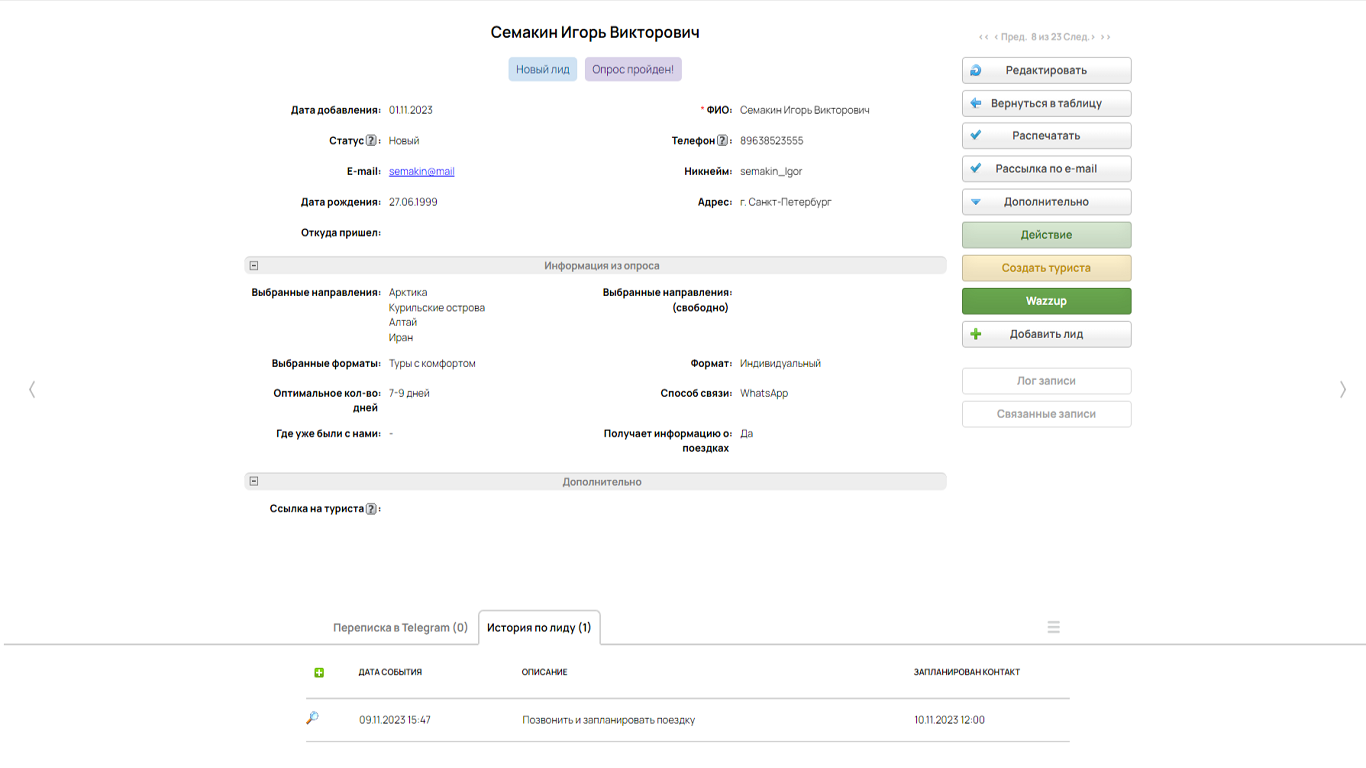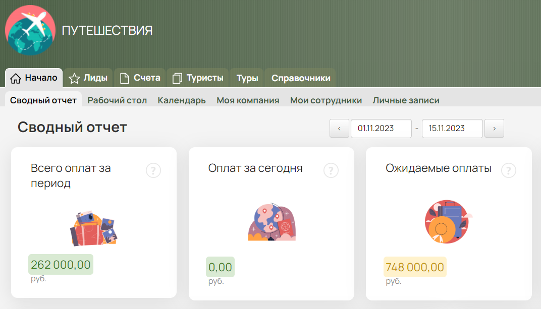 Предлагаем CRM решение для тех компаний и частных лиц, которые организуют собственные туры по России и зарубежью. Данная CRM поможет вести учет каждого обращения, собирать группы, общаться с участниками, подключать к работе менеджеров и контролировать все это онлайн.