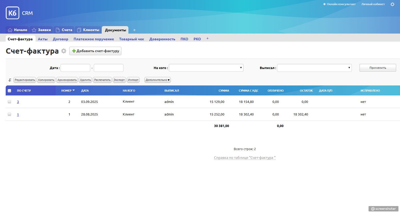 Формируйте счета-фактуры, УПД, акты, доверенности, платёжные поручения, ПКО, РКО и товарные чеки — быстро, удобно и без ошибок.