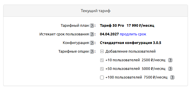 Для SAAS аккаунтов ежемесячно (после подключения опции дополнительной оплаты не потребуется, но общий срок действия аккаунта будет пересчитан в соответствии с добавленной стоимостью выбранной опции) Условия использования тарифной опции описаны в документации На текущий момент опция доступна для следующих тарифов: Все просто. Перейдите в Личный кабинет. В блоке "Текущий тариф" раскройте список пакетов, нажав на "+" для опции "Добавление пользователей". Выберите один или несколько пакетов, прочитайте во всплывающем окне условия использования опции. После нажатия "Ок" ваш тарифный план будет пересчитан в соответствии со стоимостью выбранного пакета. Далее в разделе "Настройки" "Пользователи" будет пересчитано количество доступных пользователей. При возникновении вопросов рекомендуем создать тикет в службу технической поддержки.